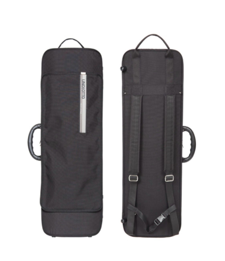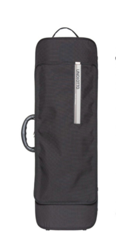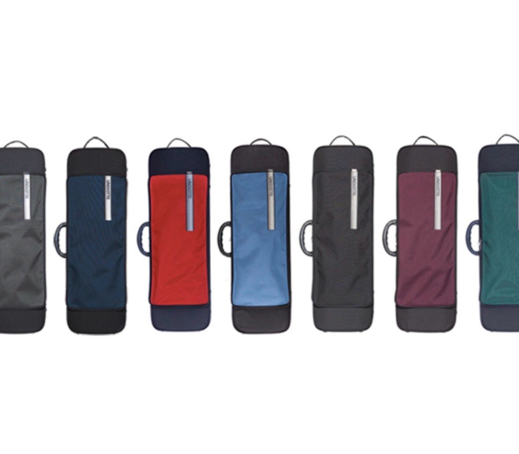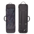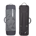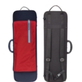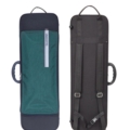 Oblong shape, waterproof and rip resistant. Interchangeable external cover with music pocket. Big compartment. Four bow holders. Strings tube. Central handle. Fabric handle on the short side. Feet on the opposite side. Suspension system of the instrument and cushion to block the instrument integrated in the lid. Fixed padded adjustable shoulder straps on the back and joining for shoulder straps. Inner lining made of soft anti-stratch fabric.