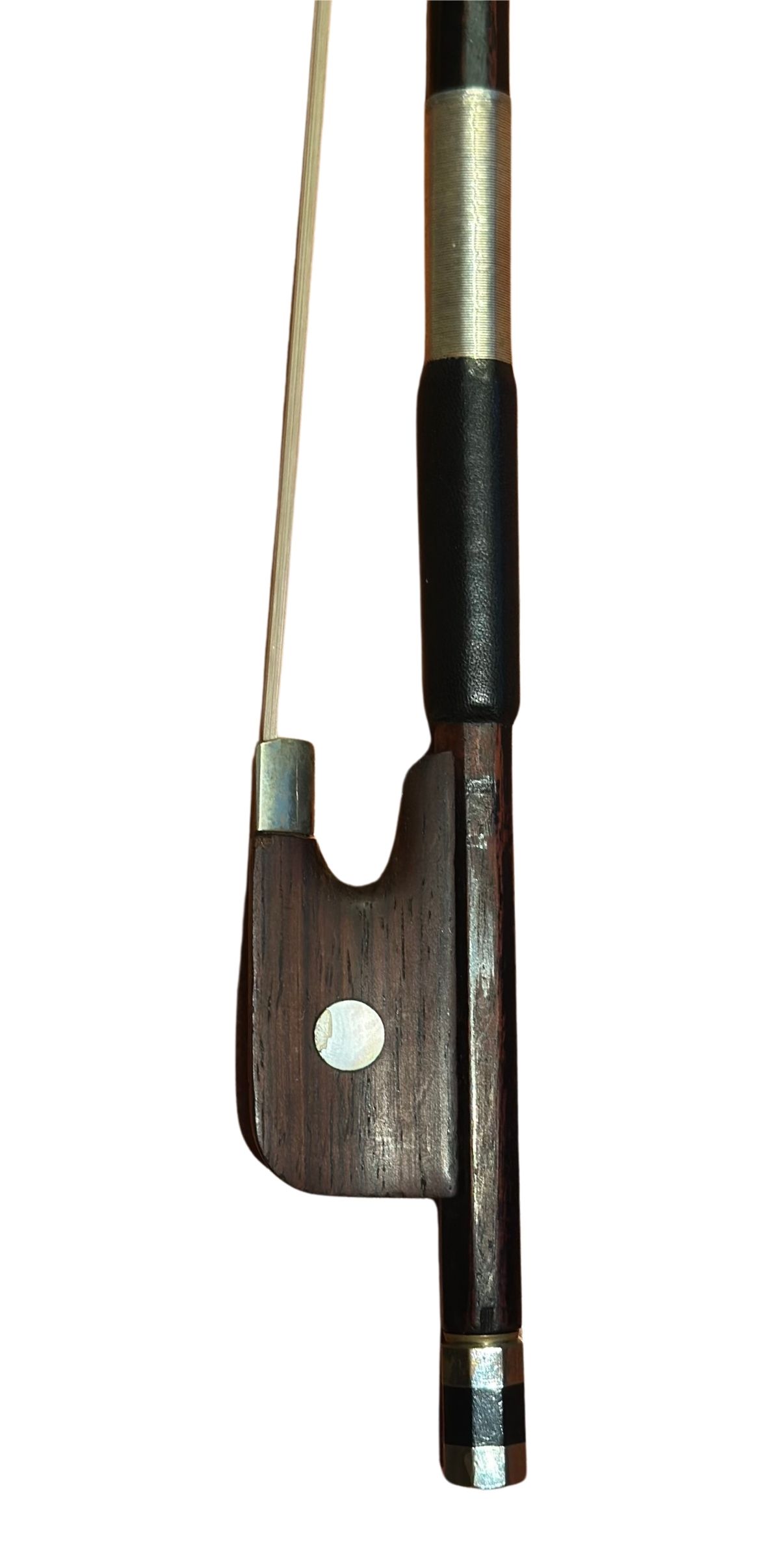 Cello bow made in England in 1920s. Rosewood frog. Painted black.