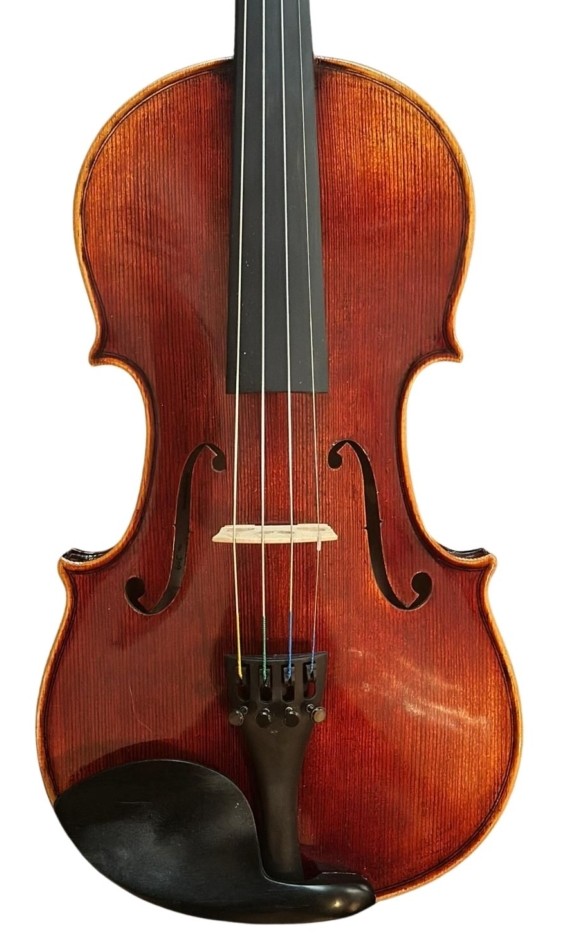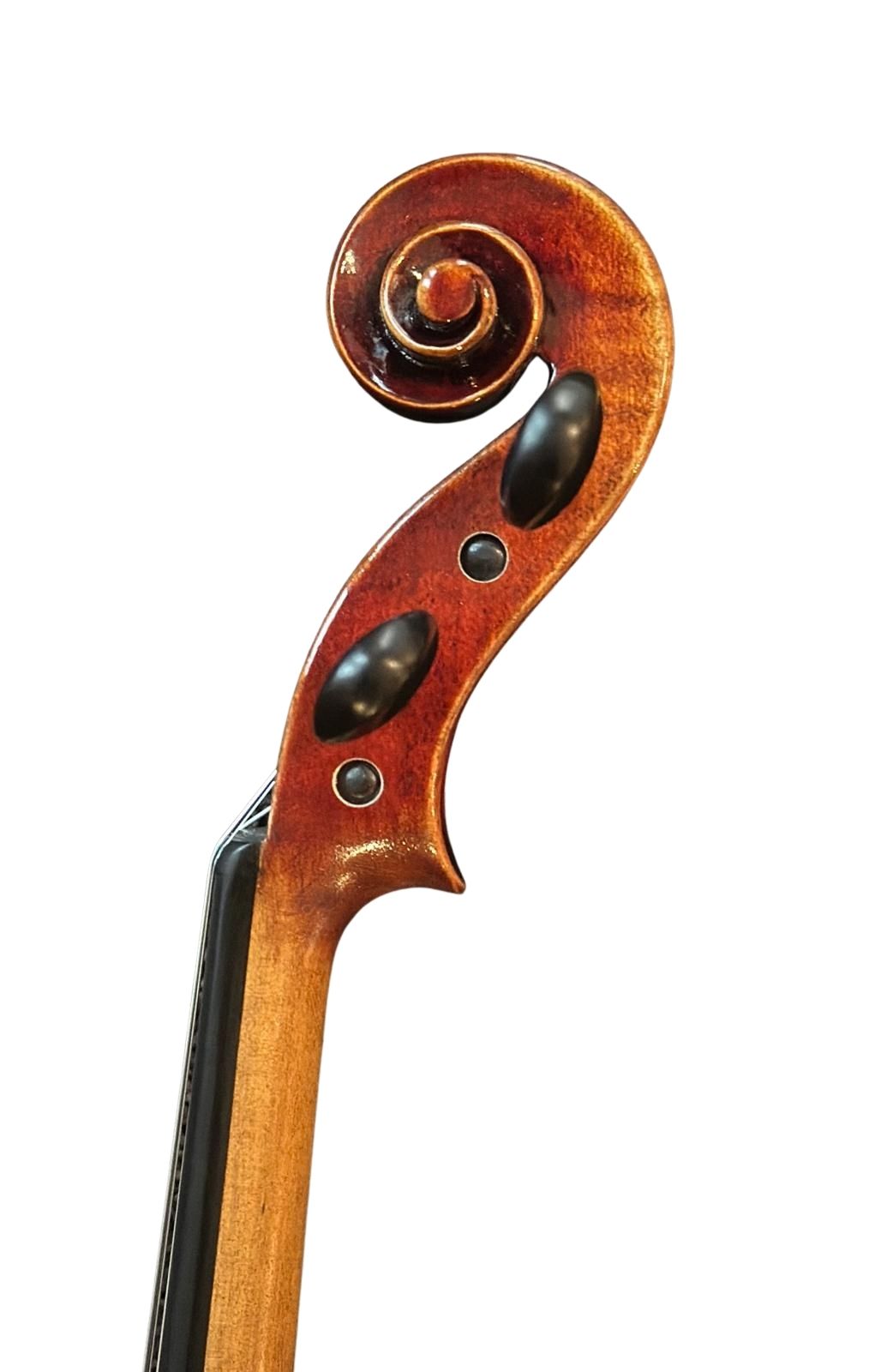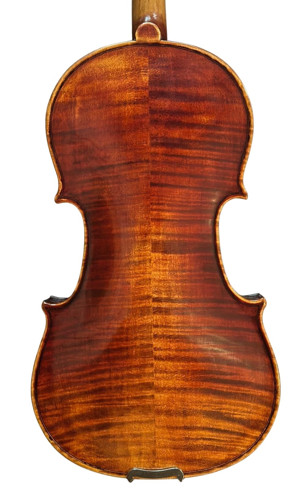Dark red-brown varnish, with an old-Schönbach-style varnish. Selected parts of the varnish are washed and slightly patinated, giving the violins the appearance of an older, yet well-maintained instrument.