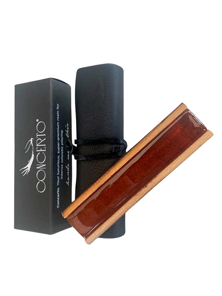 Concero Soloistic Intensity. Leatherwood Concerto rosin is a luxurious, super-premium rosin for intense soloistic playing. Designed by the soloists for the soloists, power, focus and projection are prominent with minimal dust and sound deterioration. The rosin offers a very powerful and clear attack on the string, with the string vibrating at it’s maximum capability from the very beginning of the bow movement. It improves sound endurance, overall projection, power, with a warm undertone.