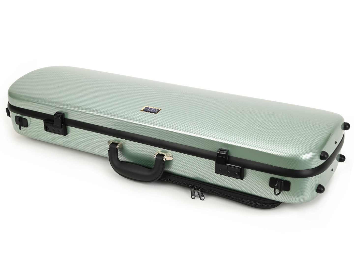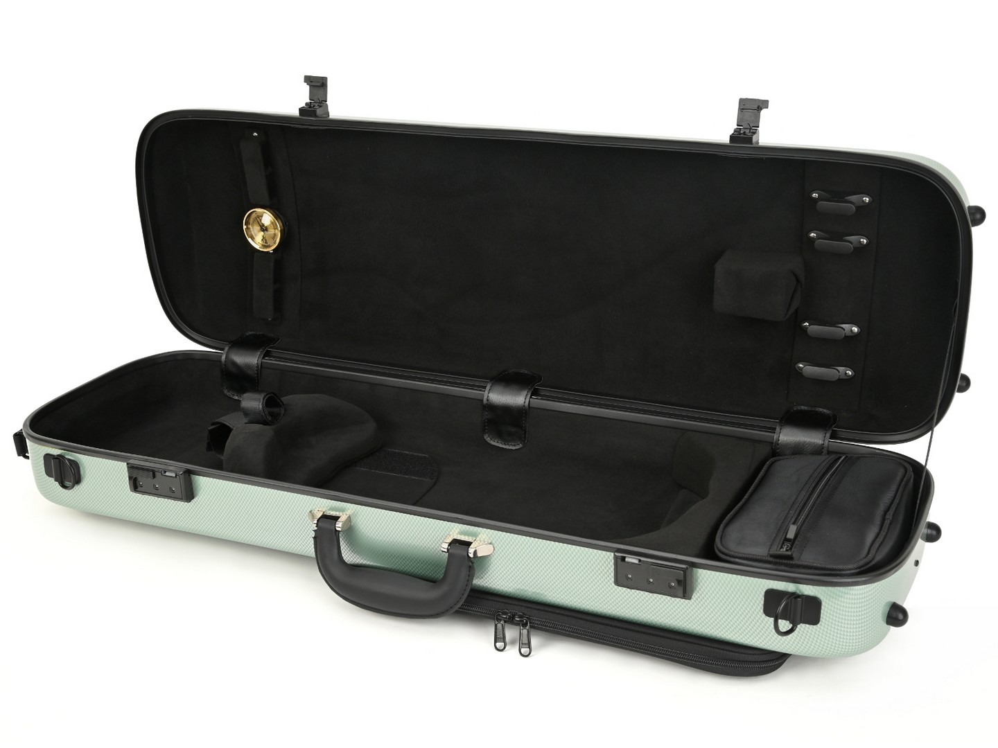 The case interior is adjusting to the body of the instrument. Has a practical rectangular shape, an interior lined by a soft flannel, a velcro holding the shoulder rest and a velcro strap for violin neck. Four bow spinners, hygrometer, instrument blanket. Comfortable handle covered in leather, and a second handle for holding the case in vertical. The locks and the other metal parts are black, comes with a combination locks. Nice color options. Made in China.