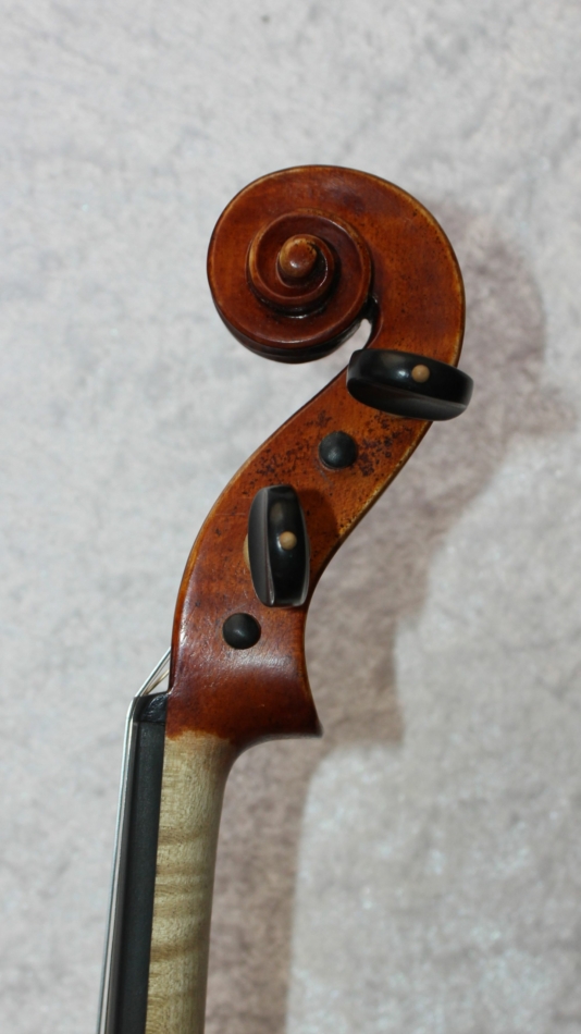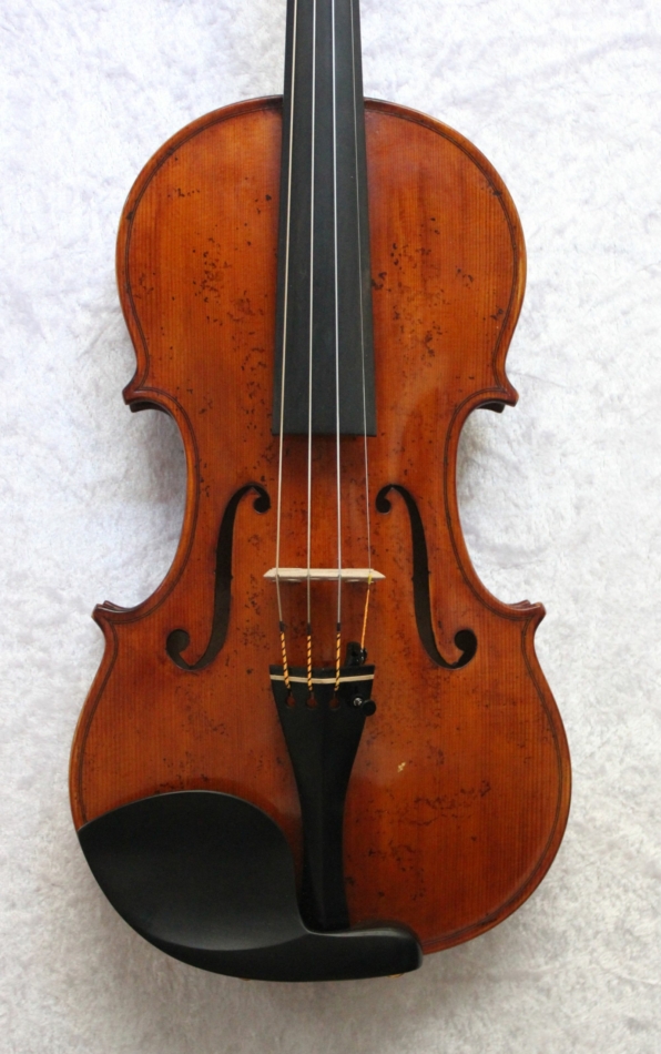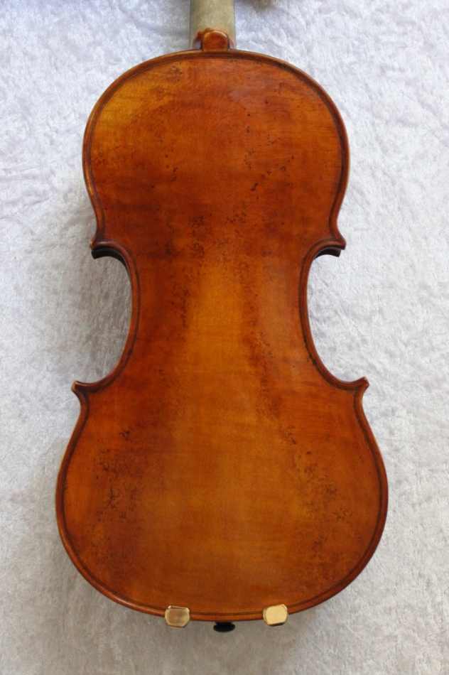 Top Qualität Studentengeigen mit einem kräftigen, warmen und gereiften Klang. In Reghin, Rumänien handgemacht. Schöne regelmäßige Fichtendecke. Einteiliger mild geflammter Bergahornboden. Orangeroter, heller Spirituslack. Milo Stamm Steg. Indisches Ebenholz Wirbel, Kinn- und Saitenhalter. Exzellente spielfertigkeit. Stradivari 1715 Il Cremonese Modell.