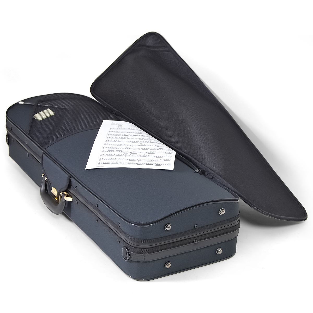 Der SuperLight-Kasten bietet Instrumenten von 38 bis 43 cm Korpuslänge Platz. Innen ist das Etui mit schwarzem Samt ausgekleidet. Es gibt drei Bogenhalter, ein Saitenrohr und Verstauraum für Schulterstütze & Co.